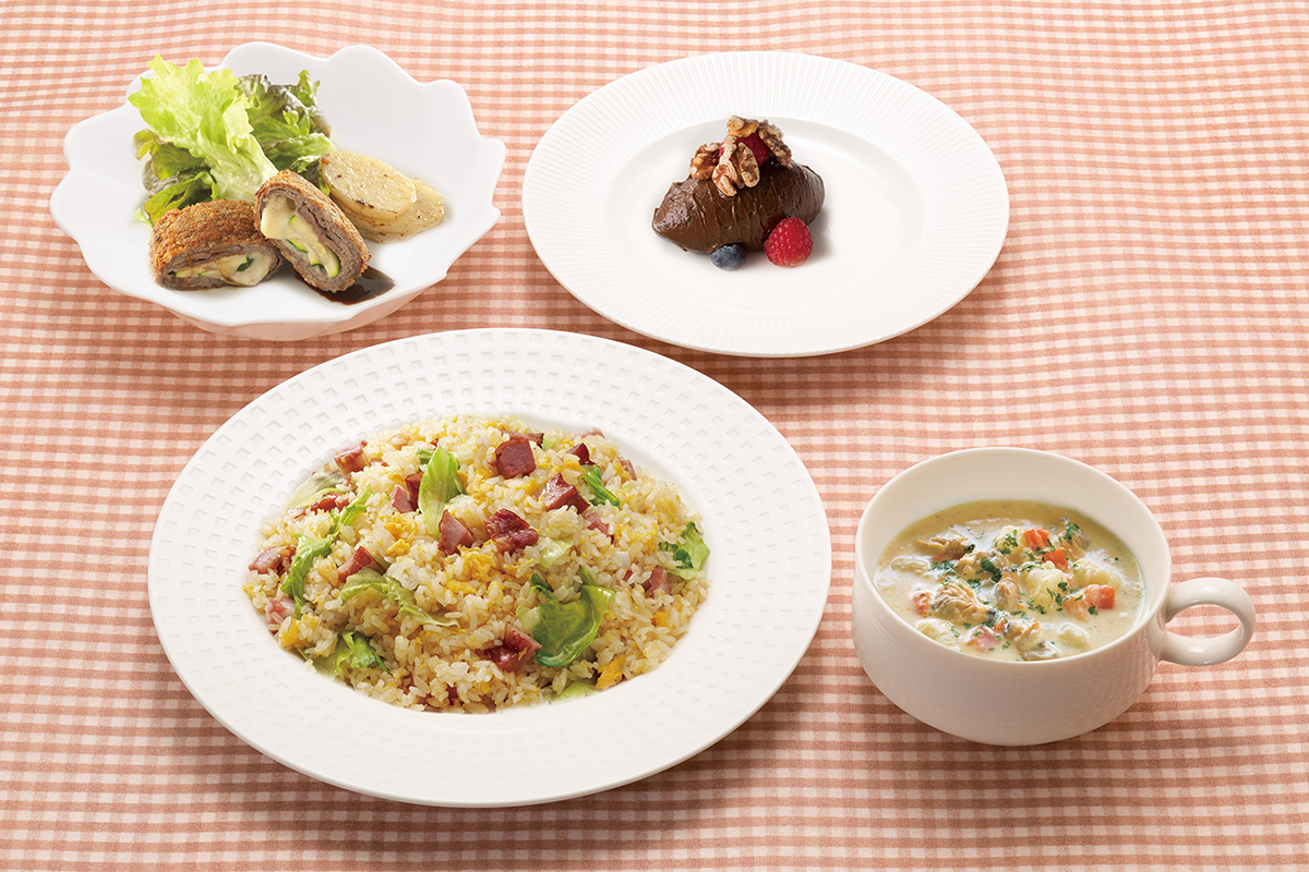 《メニュー》 レタスチャーハン/牛肉のチーズ巻き/濃厚クラムチャウダー/チョコレートムース